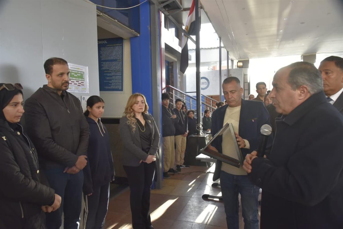 خلال طابور الصباح.. محافظ بورسعيد يزور مدرسة السباح يوسف ويعزي أسرته