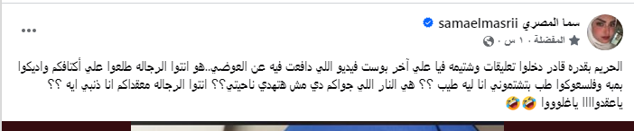 وقالت سما المصري، في منشور عبر صفحتها الرسمية على موقع الوتواصل الاجتماعي “فيس بوك”، إنها تعرضت لهجوم وشتائم عقب دفاعها عن العوضي، وكتبت: «الحريم بقدره قادر دخلوا تعليقات وشتيمة فيا على آخر بوست اللي دافعت فيه عن العوضي».