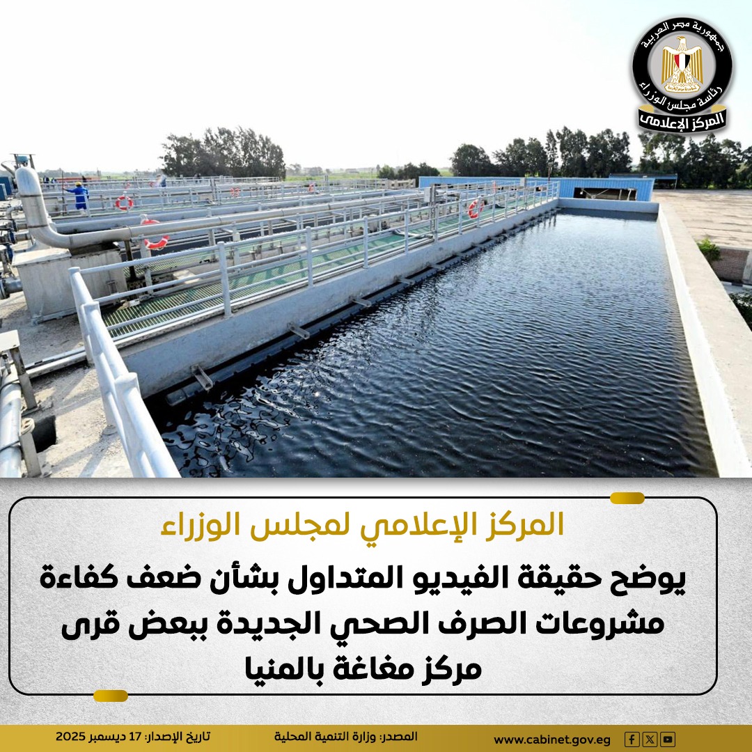 نشر المركز الإعلامي لمجلس الوزراء بيانًا عبر منصاته على مواقع التواصل الاجتماعي، أوضح من خلاله حقيقة الفيديو المتداول بشأن ضعف كفاءة مشروعات للصرف الصحي في عدد من قرى مركز مغاغة بالمنيا.