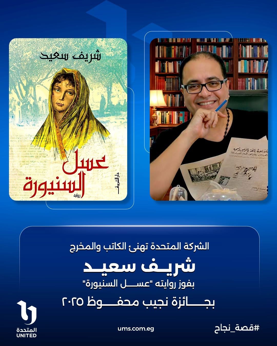 تتقدم الشركة المتحدة للخدمات الإعلامية بخالص التهنئة إلى الكاتب والمخرج شريف سعيد رئيس القطاع الوثائقي بالشركة المتحدة، بمناسبة فوز روايته «عسل السنيورة» بـ جائزة نجيب محفوظ لأفضل رواية مصرية لعام 2025.