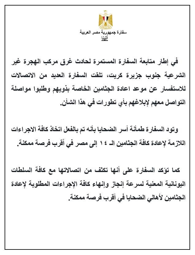 كما أكدت السفارة على أنها تكثف من اتصالاتها مع كافة السلطات اليونانية المعنية لسرعة إنجاز وإنهاء كافة الإجراءات المطلوبة لإعادة الجثامين الأهالي الضحايا في أقرب فرصة ممكنة.