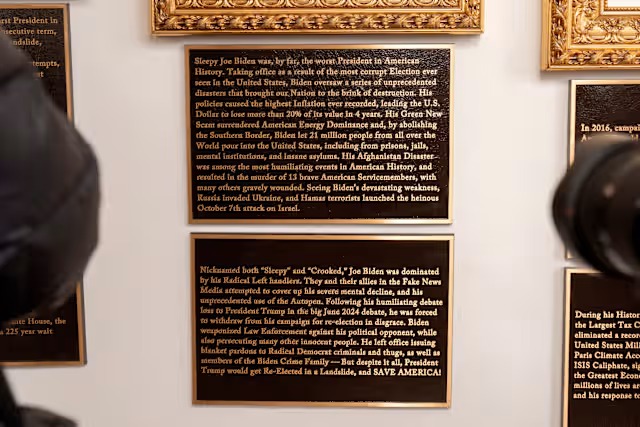 نُقش على لوحتي بايدن ما يلي: “كان جو بايدن، بلا منازع، أسوأ رئيس في تاريخ أمريكا. فبعد توليه منصبه إثر انتخابات شهدت أكثر الانتخابات فسادًا في تاريخ الولايات المتحدة، أشرف بايدن على سلسلة من الكوارث غير المسبوقة التي أوصلت أمتنا إلى حافة الهاوية. تسببت سياساته في أعلى معدل تضخم مسجل على الإطلاق، ما أدى إلى فقدان الدولار الأمريكي أكثر من 20% من قيمته في غضون أربع سنوات”.