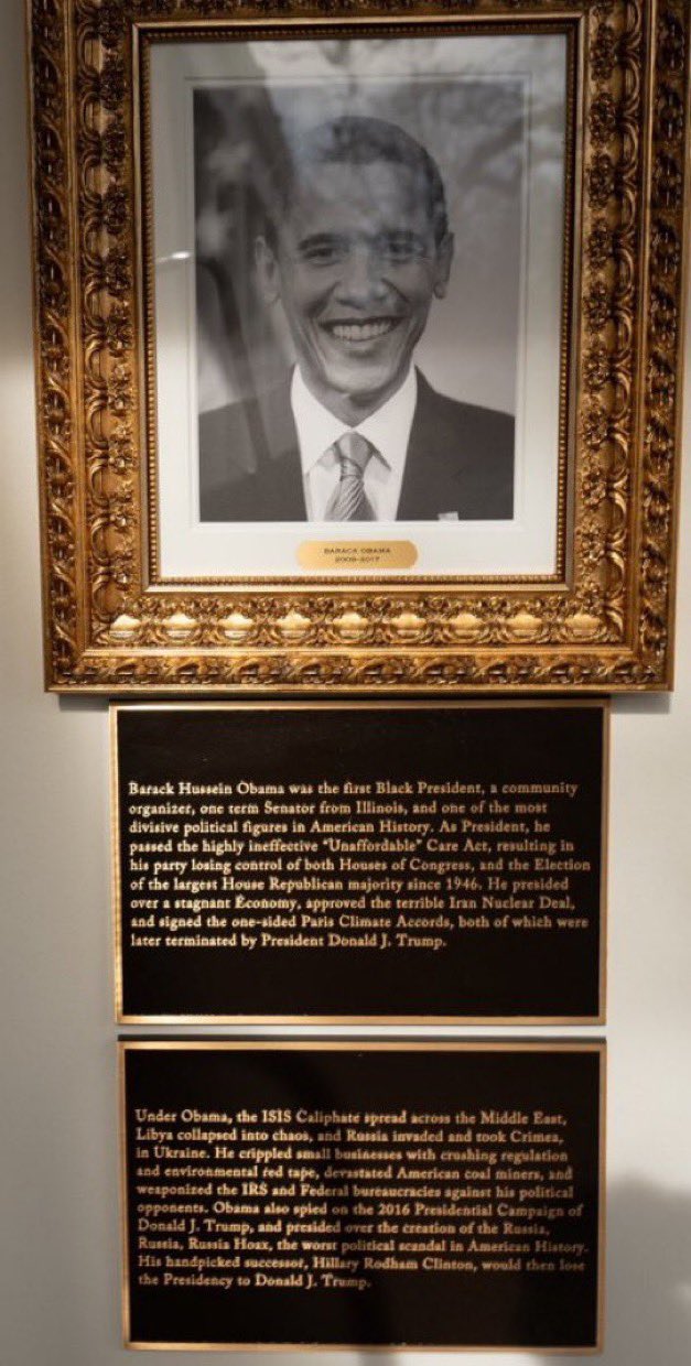 تقول لوحات أوباما: "كان باراك حسين أوباما أول رئيس أسود، ومنظمًا مجتمعيًا، وعضوًا في مجلس الشيوخ عن ولاية إلينوي لفترة واحدة، وأحد أكثر الشخصيات السياسية إثارةً للجدل في التاريخ الأمريكي. بصفته رئيسًا، أقر قانون الرعاية الصحية "غير الميسورة التكلفة" غير الفعال للغاية، مما أدى إلى فقدان حزبه السيطرة على مجلسي الكونغرس، وانتخاب أكبر أغلبية جمهورية في مجلس النواب منذ عام 1946".