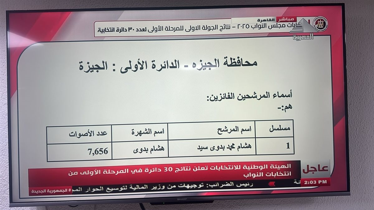 وأكدت الهيئة فوز المرشح هشام بدوى بعد حصوله على عدد اصوات 7656 بعضوية مجلس النواب 2025 عن الدائرة الاولى بالجيزة ومقرها الجيزة .