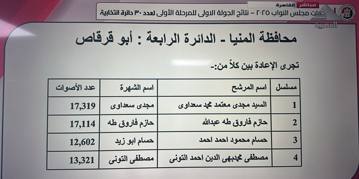 وأكدت الهيئة الإعادة فى الدائرة الرابعة بمحافظة المنيا ومقرها أبو قرقاص على عضوية مجلس النواب 2025 بين كل من المرشح العمدة مجدى سعدواى لحصوله على 17319 والمرشح حازم فاروق طه لحصوله على 17114، والمرشح حسام أبو زيد لحصوله على 12602، والمرشح مصطفى التونى لحصوله على 13321.