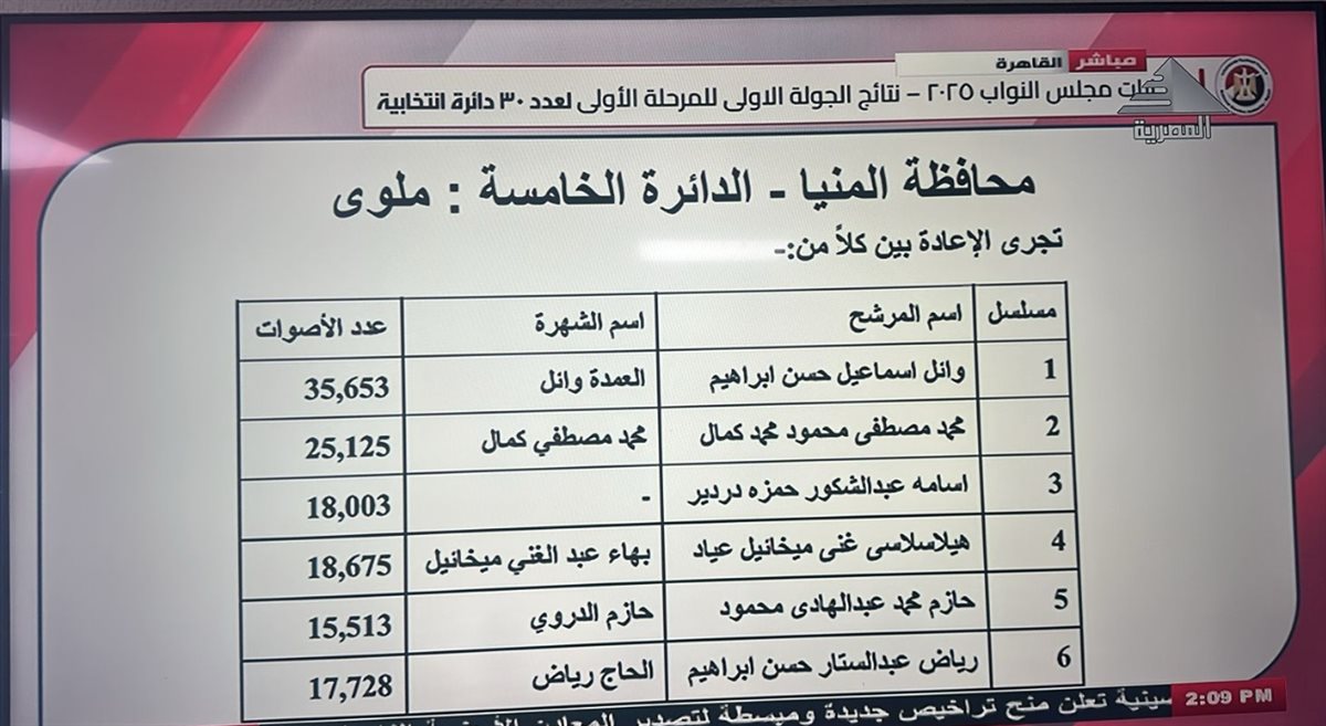 وأكدت الهيئة الإعادة فى الدائرة الخامسة بمحافظة المنيا ومقرها ملوى على عضوية مجلس النواب 2025 بين كل من المرشح العمدة وائل لحصوله على 35653 والمرشح محمد مصطفى كمال لحصوله على 25125، والمرشح اسامه عبدالشكور لحصوله على 18003، والمرشح بهاء ميخائيل لحصوله على 18675، والمرشح حازم الدروى لحصوله على 15513، والمرشح الحاج رياض لحصوله على 17728.