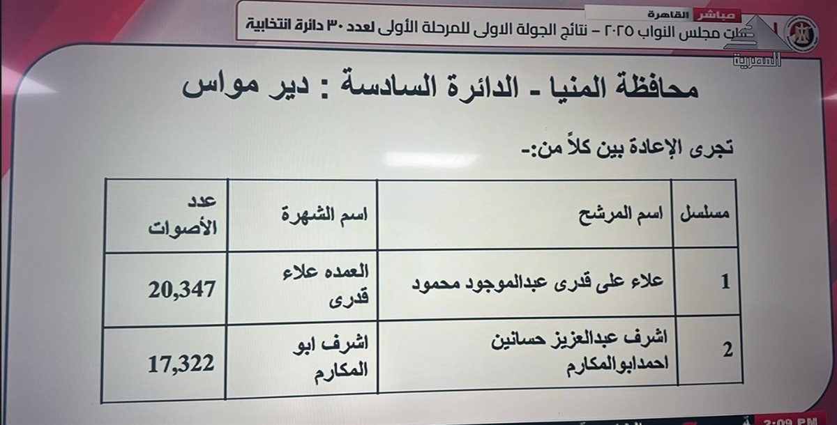 وأكدت الهيئة الإعادة فى الدائرة السادسة بمحافظة المنيا ومقرها ديرمواس على عضوية مجلس النواب 2025 بين كل من المرشح العمدة علاء قدرى لحصوله على 20347 والمرشح اشرف ابو المكارم لحصوله على 17322.