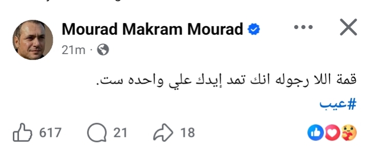 جاء ذلك في منشور له عبر موقع التواصل الاجتماعي «فيسبوك»، أثار جدلا واسعًا بين المتابعين، قال فيه: «قمة اللا رجوله انك تمد إيدك علي واحده ست».