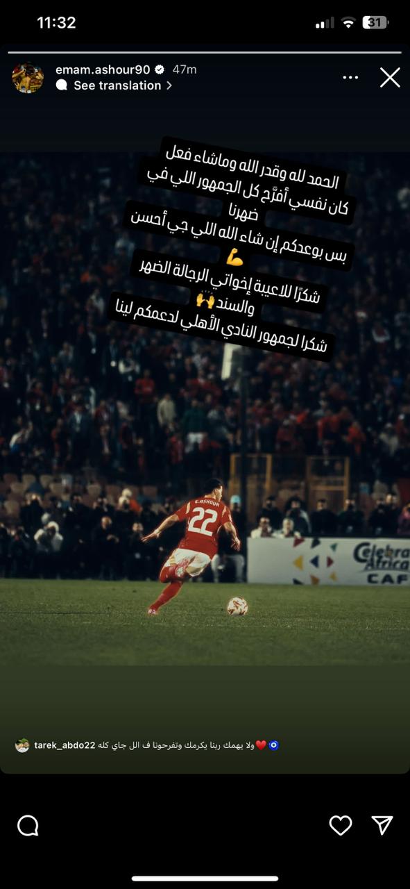 وقال إمام عاشور في تدوينة له على موقع التواصل الاجتماعي انستجرام: الحمد لله وقدر الله وماشاء فعل، كان نفسي أفرح كل الجمهور اللى في ضهرنا، بس بوعدكم إن شاء الله اللي جاي أحسن، شكرا لكل اللعيبة إخواتي الرجالة انتوا الضهر والسند وشكرا لجمهور النادي الأهلي على دعمكم لينا.
