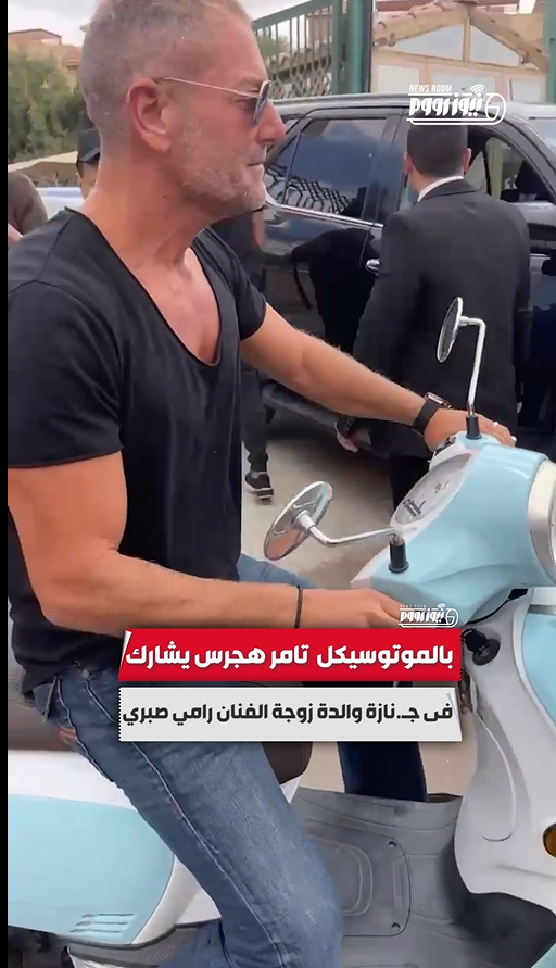 بالموتوسيكل.. تامر هجرس يشارك في جنازة والدة زوجة الفنان رامي صبري