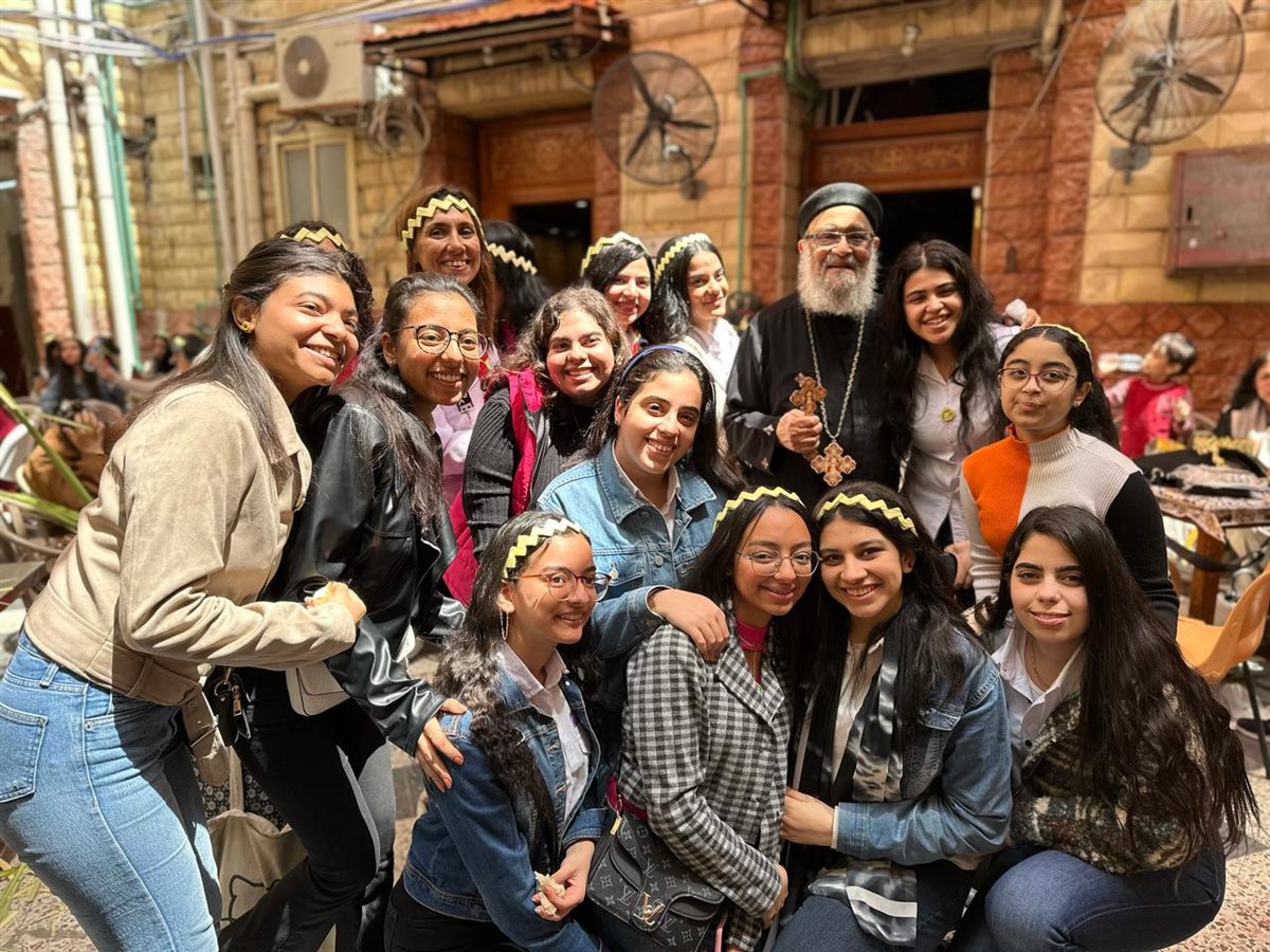 وزينت التيجان المصنوعة من الخوص رؤوس وشعر الفتيات بكنيسة الانبا بيشوي بمحافظة بورسعيد ، وأخذت الفتيات يلتقطن الصور الفوتوغرافية التذكارية ، وهن يرتدين تلك التيجان وسط فرحة الجميع.