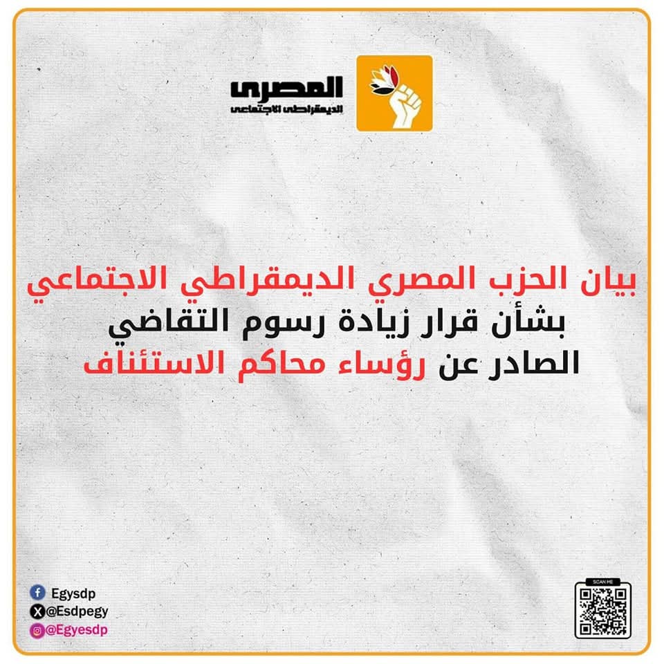 أصدر الحزب المصري الديمقراطي الاجتماعي بيانًا نشره على صفحته الرسمية موضحًا انه في لحظة تتطلب الانحياز للفئات الأضعف في المجتمع، وتأكيد حقوقها الدستورية والقانونية، أصدر رؤساء محاكم الاستئناف عددًا من القرارات، التي تتضمن زيادات في رسوم التقاضي بشكل مفاجئ، في مخالفة لنصوص الدستور ومجافاة لروح العدالة.