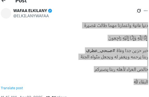 وقالت وفاء الكيلاني فى تغريدة لها من خلال حسابها الشخصى عبر “إكس” : “ دنيا فانية واعمارنا مهما طالت قصيرة إِنَّا لِلّهِ وَإِنَّـا إِلَيْهِ رَاجِعونَ خبر حزين جدا وفاة صبحى عطري ربنا يرحمه ويغفر له ويجعل مثواه الجنة خالص العزاء لأهله ربنا يصبركم البقاء لله”.