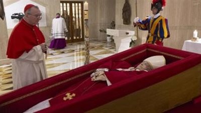 ويتم عرض التابوت أمام مظلة "سان بيدرو" الباروكية المهيبة، وقد وصل إلى مثواه الأخير، الأربعاء، في موكب من دار سانتا مارتا التي توفي فيها، وقد تم عرضه مع مسبحته التي لا تترك يديه، وكاسبول أحمر وحذاء أسود، رمزًا للتقشف.