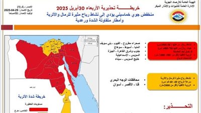 وأشارت إلى أن المنخفض الجوي، يصاحبه فرص أمطار متوسطة قد تكون غزيرة ورعدية ومصحوبة بحبات البرد أحيانًا على مناطق من محافظة مطروح تمتد خفيفة قد تكون متوسطة ورعدية أحياناً على مناطق من السواحل الشمالية والوجه البحري قد تكون خفيفة ورعدية أحيانًا على القاهرة الكبرى وشمال الصعيد ومدن القناة وسيناء.