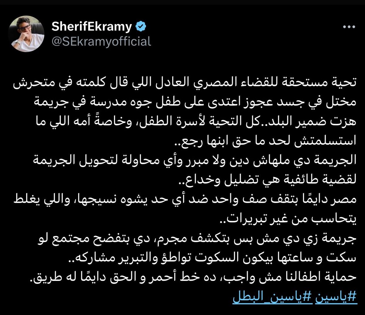 وقال شريف إكرامي في تغريدة له من خلال حسابه الرسمي عبر منصة "إكس" :" تحية مستحقة للقضاء المصري العادل اللي قال كلمته في متحرش مختل في جسد عجوز اعتدى على طفل جوه مدرسة في جريمة هزت ضمير البلد.. كل التحية لأسرة الطفل، وخاصةً أمه اللي ما استسلمتش لحد ما حق ابنها رجع".