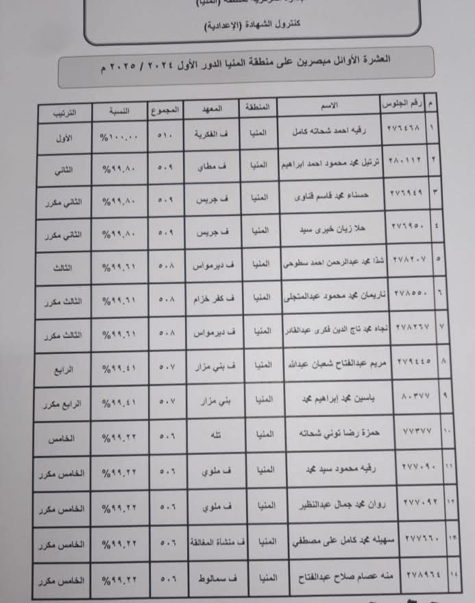 وقد تم إرفاق كشف تفصيلي بأسماء الطلاب الأوائل في كل من الشهادة الابتدائية والإعدادية، بالإضافة إلى أوائل فئة المكفوفين، ويمكنكم الاطلاع عليه من خلال الرابط أو الملف المرفق.