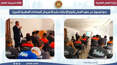 يذكر أن مديرية العمل بمحافظة الجيزة نظمت ندوة تثقيفية بعنوان "عقد العمل وتجديده وأنواع الإجازات" و ذلك بمقر شركة فريدال للصناعات العطرية، بمشاركة 20 عاملًا، وذلك من خلال مكتب عمل أكتوبر، في إطار جهود المديرية لنشر الوعي القانوني داخل مواقع العمل وتعريف العاملين بحقوقهم وواجباتهم.