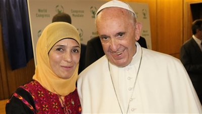"سلام ومحبة"..الفلسطينية حنان الحروب وجهًا لوجه مع بابا الفاتيكان|حكاية وصورة