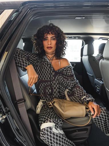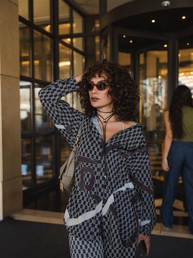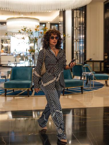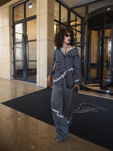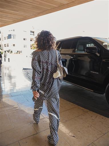 ونسقت القميص مع بنطلون ساتان فضفاض برباط ، يتميز بشرائط هندسية باللونين الرمادي والأبيض، ويزدان من الأمام بعبارة “حُبي فِلَسْطِين” مصممة من قماش مخملي ناعم.