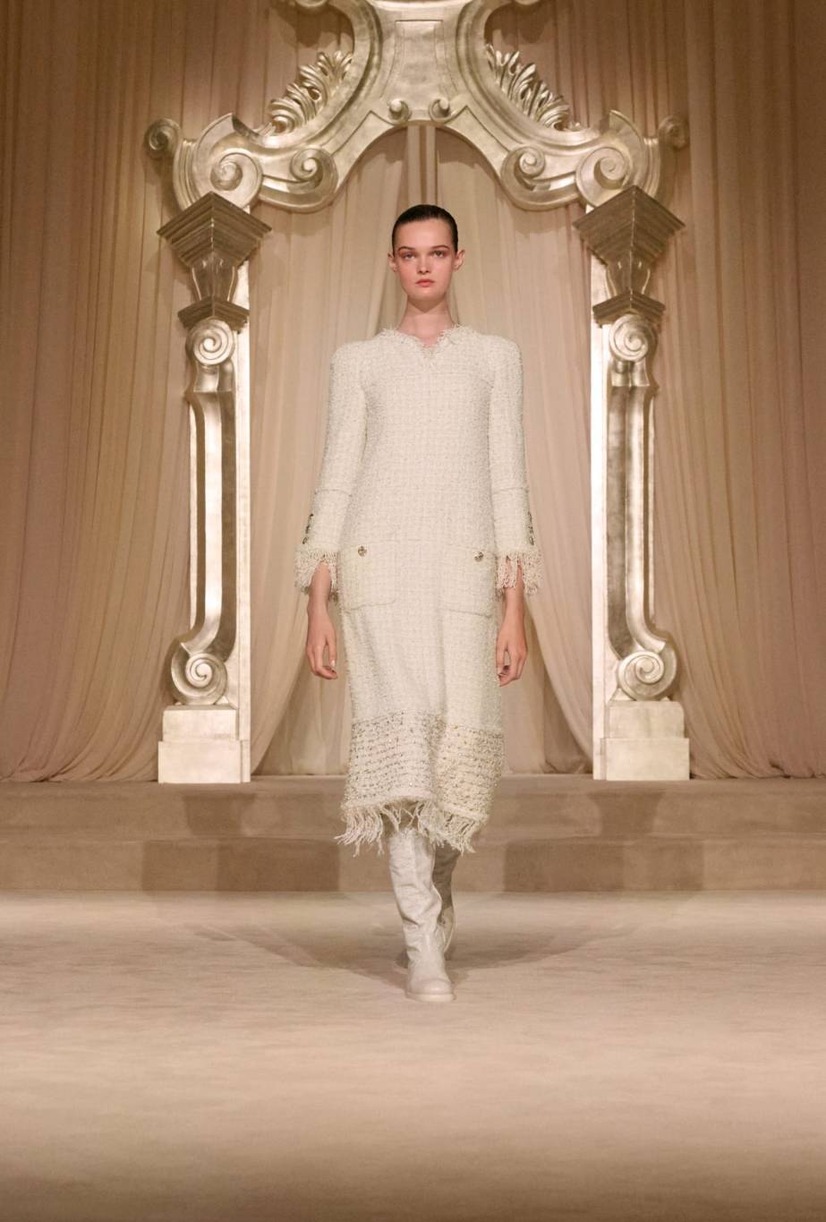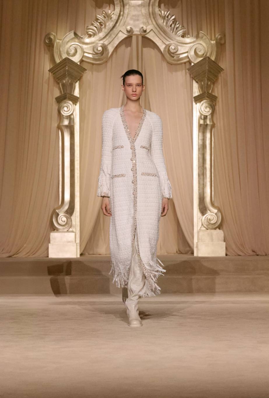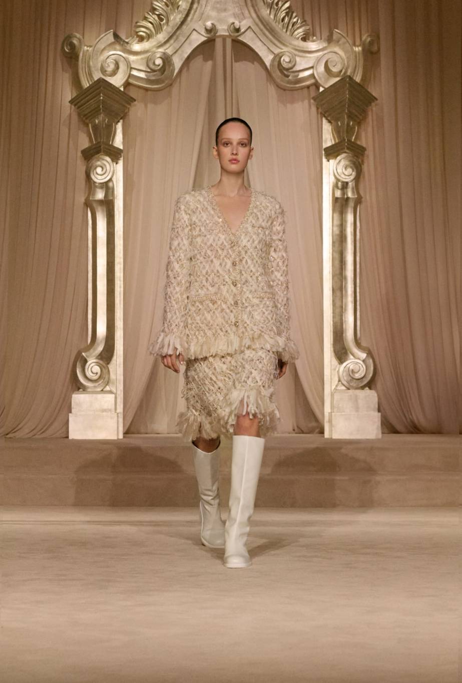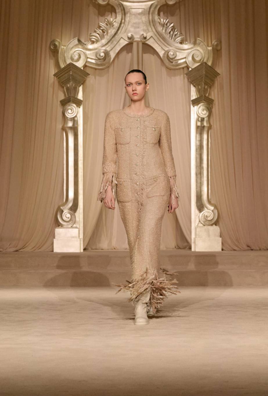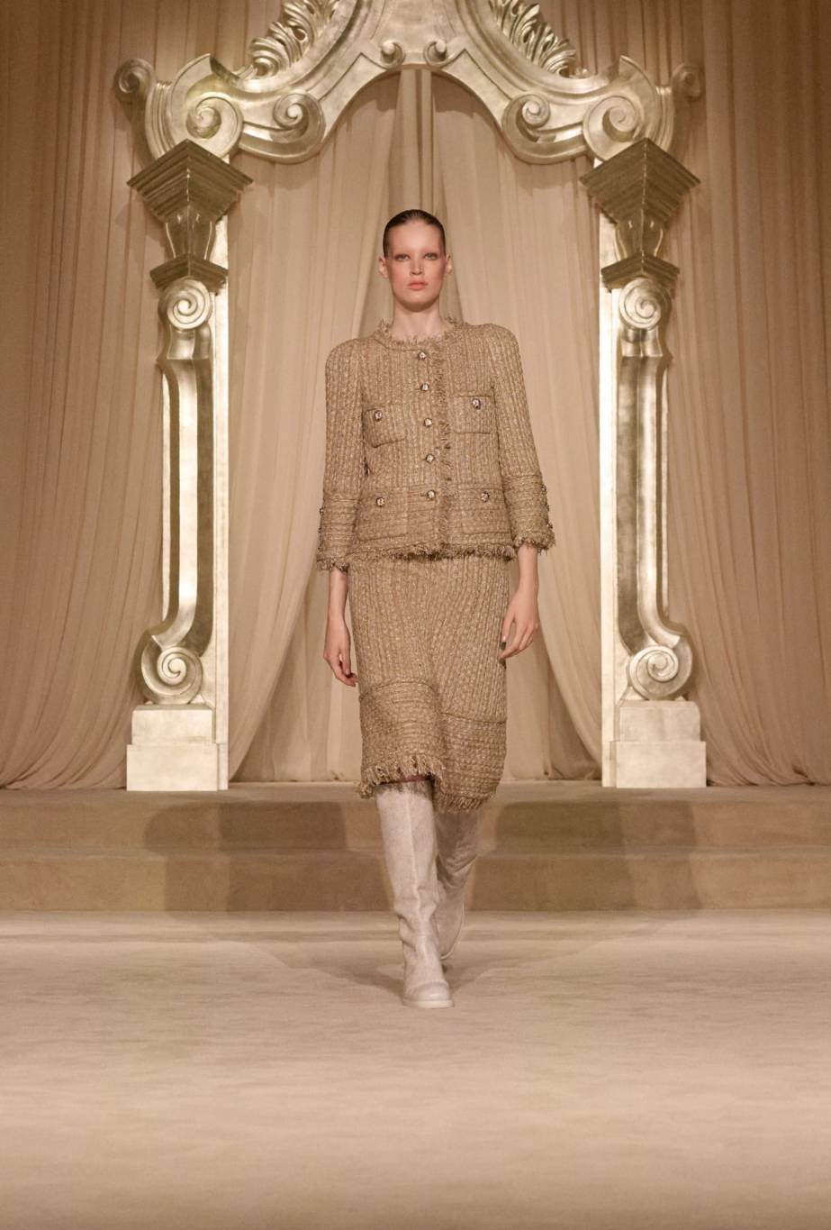 ووسط ديكور هادئ صمّمه الفنّان ويلو بيرون في صالون الشرف بقصر Grand Palais، استحضر العرض أجواء 31 شارع كامبون، حيث تبنّت الآنسة شانيل البساطة في جوهرها. وفي هذا الموسم، يأخذنا استوديو الدار CHANEL Creation Studio في رحلة إلى سهول اسكتلندا وأرياف إنجلترا، مستلهمًا منها مجموعة غنيّة بالخامات والألوان الطبيعيّة مثل البيجيّ والعاجيّ والبنيّ والأخضر والأسود. ومن خلال القصّات المستوحاة من الأزياء الرجاليّة، تقدّم الدار الفرنسيّة حريّة وانسيابية، مغلّفتيْن بأناقة شتويّة فاخرة.