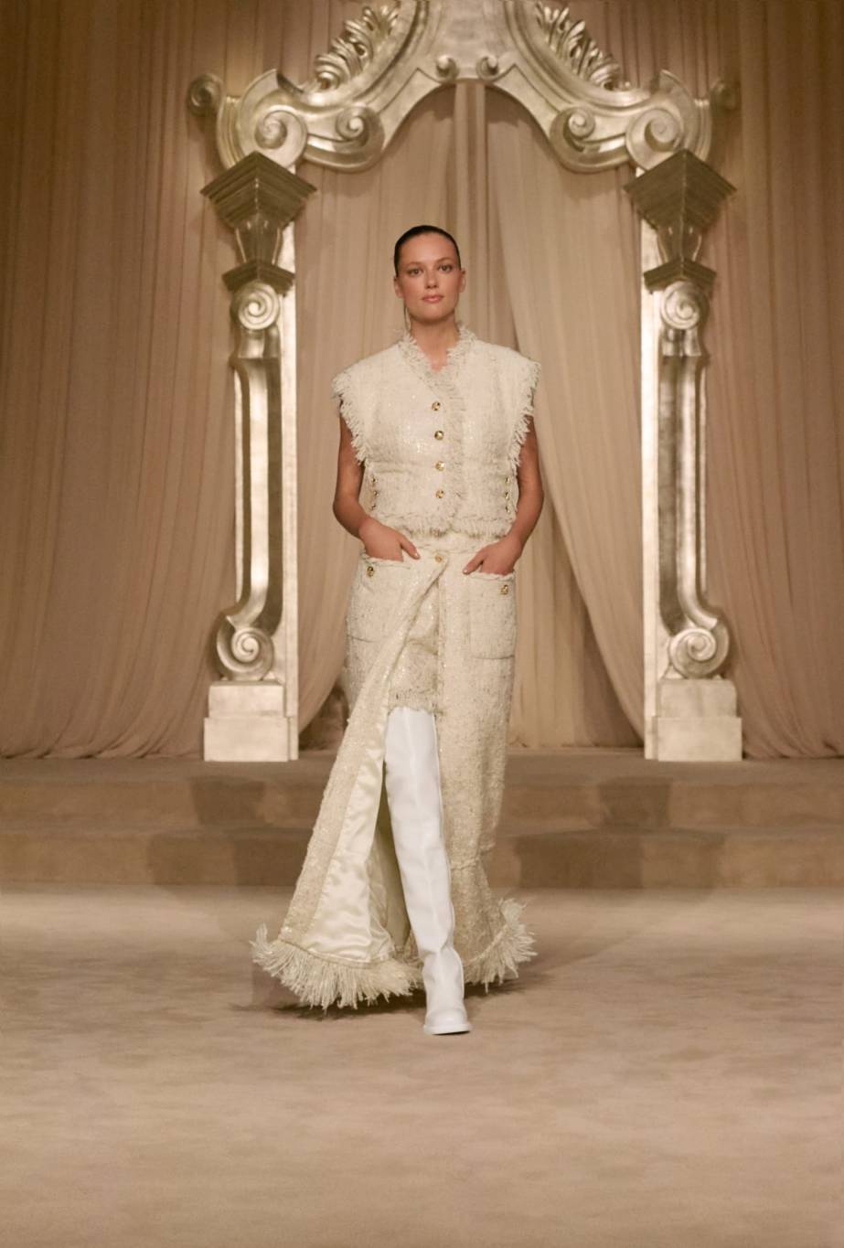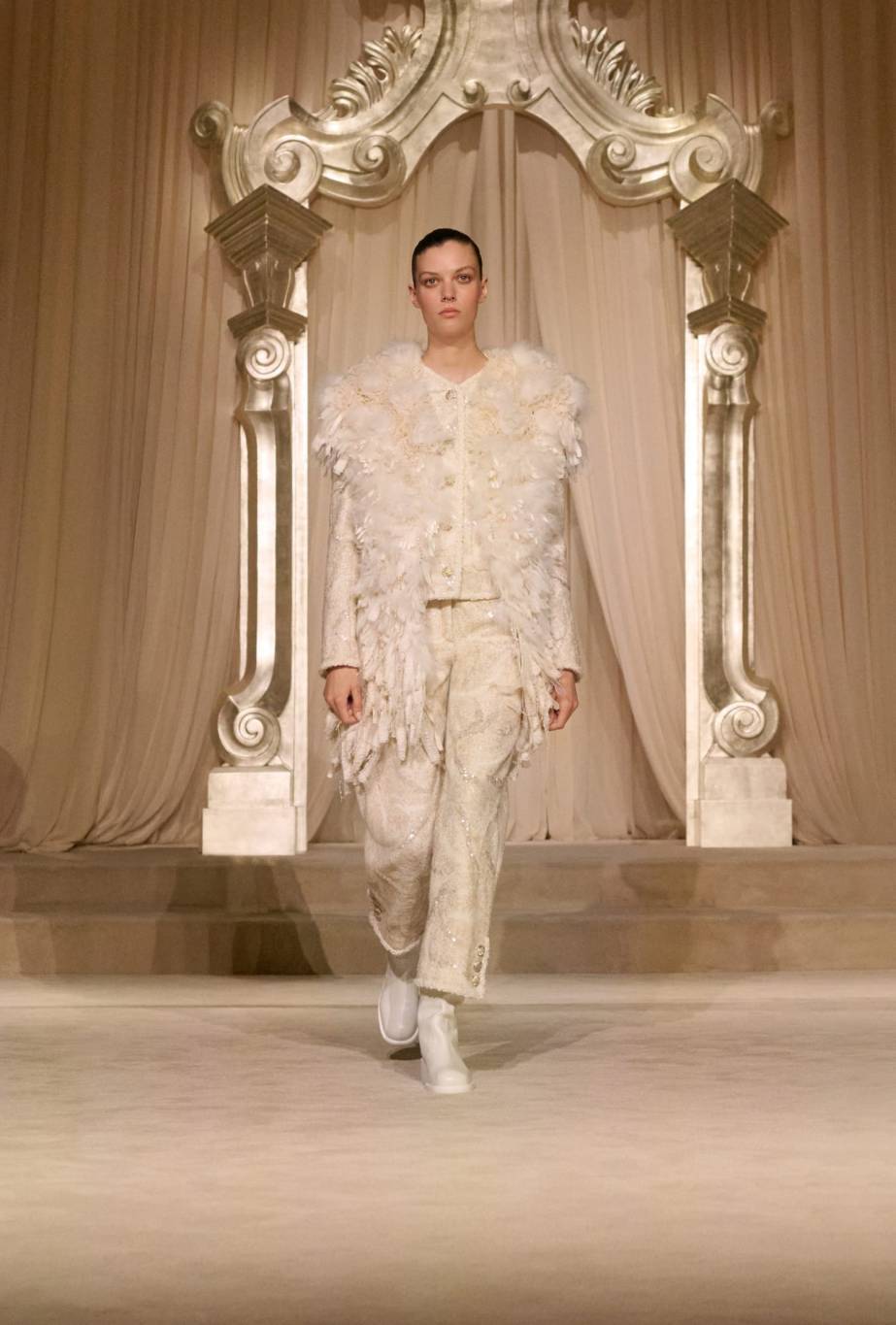 ظهرت ملابس السهرة، التي لطالما كانت عامل جذب رئيسي لعملاء شانيل في عالم الأزياء الراقية، بأشكال أخفّ تُوحي بالتركيبية والخيال. طفت بلوزات الشيفون البيضاء فوق طبقات داخلية من الدانتيل المزخرف، وأضفت تنانير ماكسي من التول الممزق حركةً وشفافية. صُممت هذه الإطلالات كمجموعة من الخيارات أكثر منها إعلانًا عن التغيير، وعكست تجربة الصالون نفسها - تجربة يمزج فيها العملاء القطع وينسقونها ويُكيّفونها بما يتناسب مع رؤيتهم الشخصية للأناقة.
