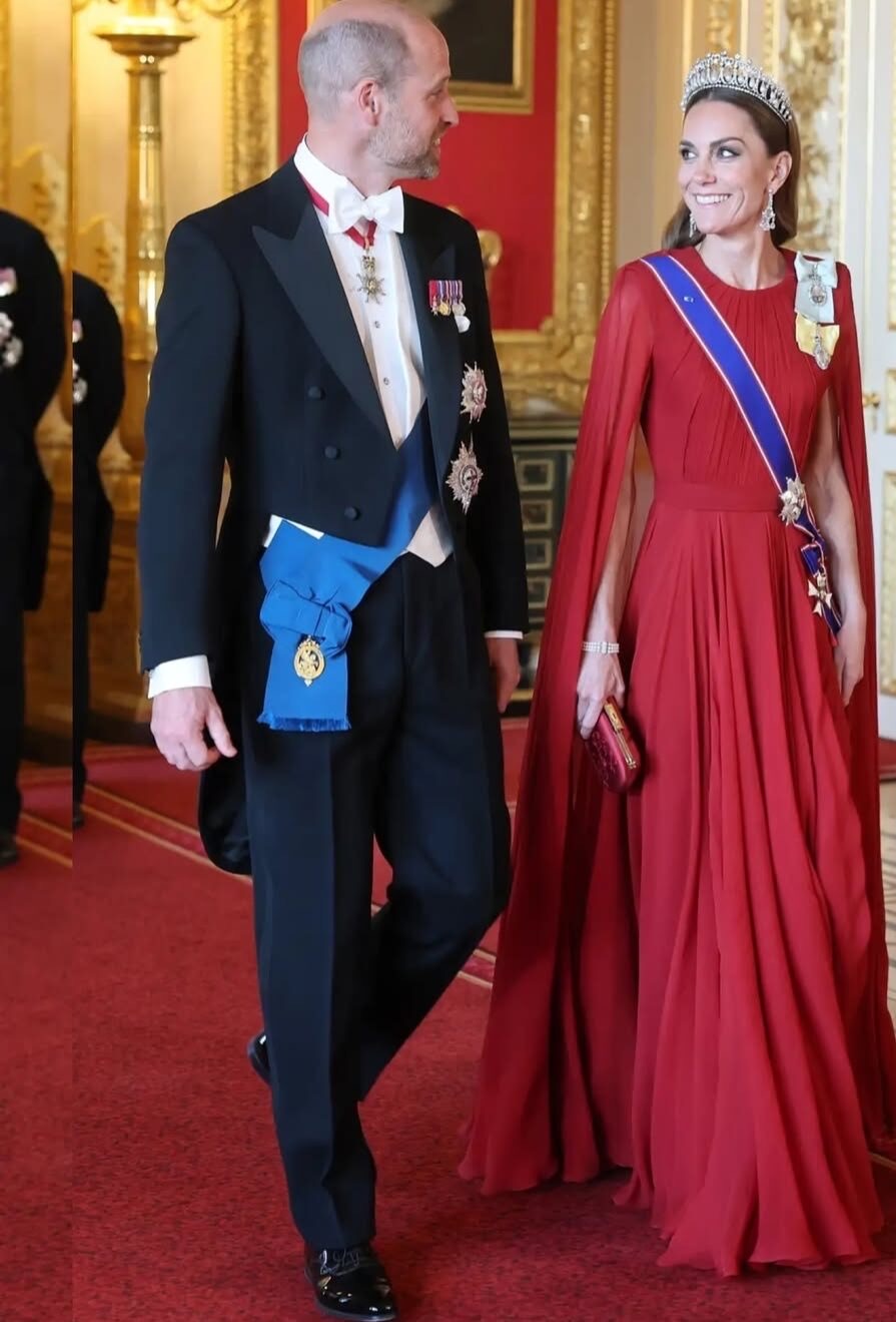 كيت اختارت فستاناً أنيقاً باللون الأحمر من تصميم سارة بورتون لدار Givenchy، مصحوباً بكاب طويل، وأقراط من مجوهرات الملكة إليزابيث الثانية الراحلة، لتكتمل إطلالتها بأناقة ملكية مستوحاة من التراث الملكي العريق.