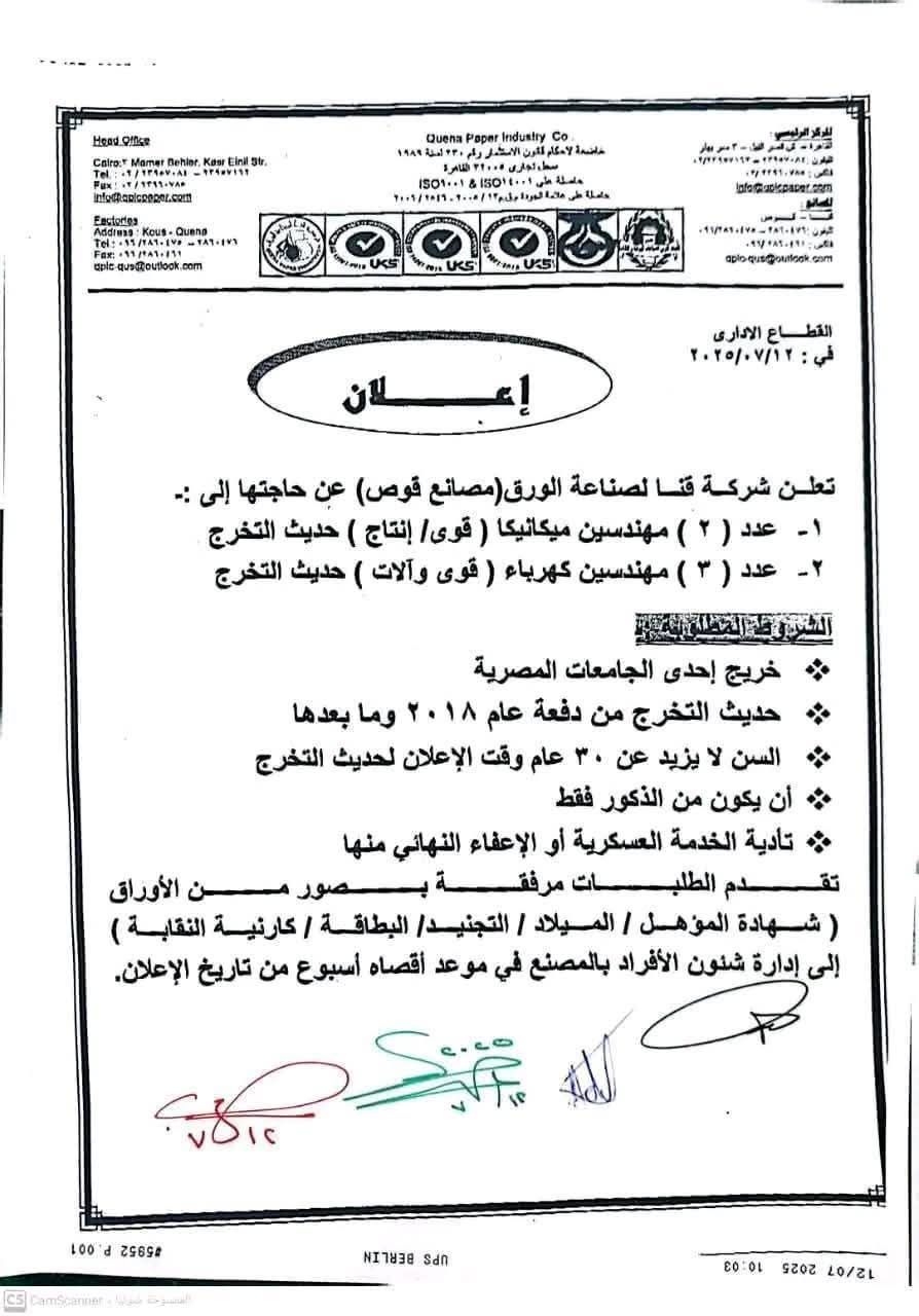 أعلن مصنع الورق التابع لمركز قوص ،جنوب محافظة قنا عن حاجته لـ 5 مهندسين حديث التخرج "كهرباء_ميكانيكا".