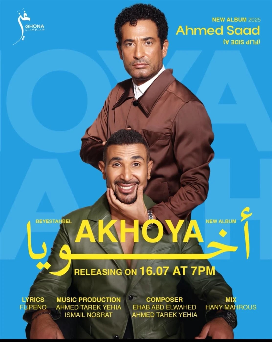 كشف الفنان أحمد سعد عن البوستر الرسمي لأغنيته الجديدة "أخويا"، والتي تأتي ضمن أغنيات ألبومه المنتظر "بيستهبل"، المقرر طرح المرحلة الأولى منه يوم الأربعاء المقبل. وأثار البوستر تفاعلاً واسعًا عبر مواقع التواصل الاجتماعي، حيث تصدره الفنان أحمد سعد إلى جانب شقيقه النجم عمرو سعد، في إشارة إلى استمرار التعاون الفني بينهما والذي طالما حقق نجاحًا لافتًا.