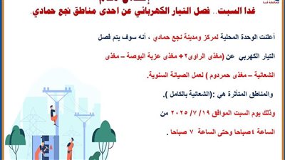 أعلن فرع شركة الكهرباء بالتنسيق مع الوحدة المحلية لمركز ومدينة فرشوط شمال محافظة قنا ،عن قطع التيار لأعمال الصيانة الدورية عن عدد من المناطق من الساعه السابعة صباحا وحتي الساعه الثامنة صباحا وذلك غدا السبت.
