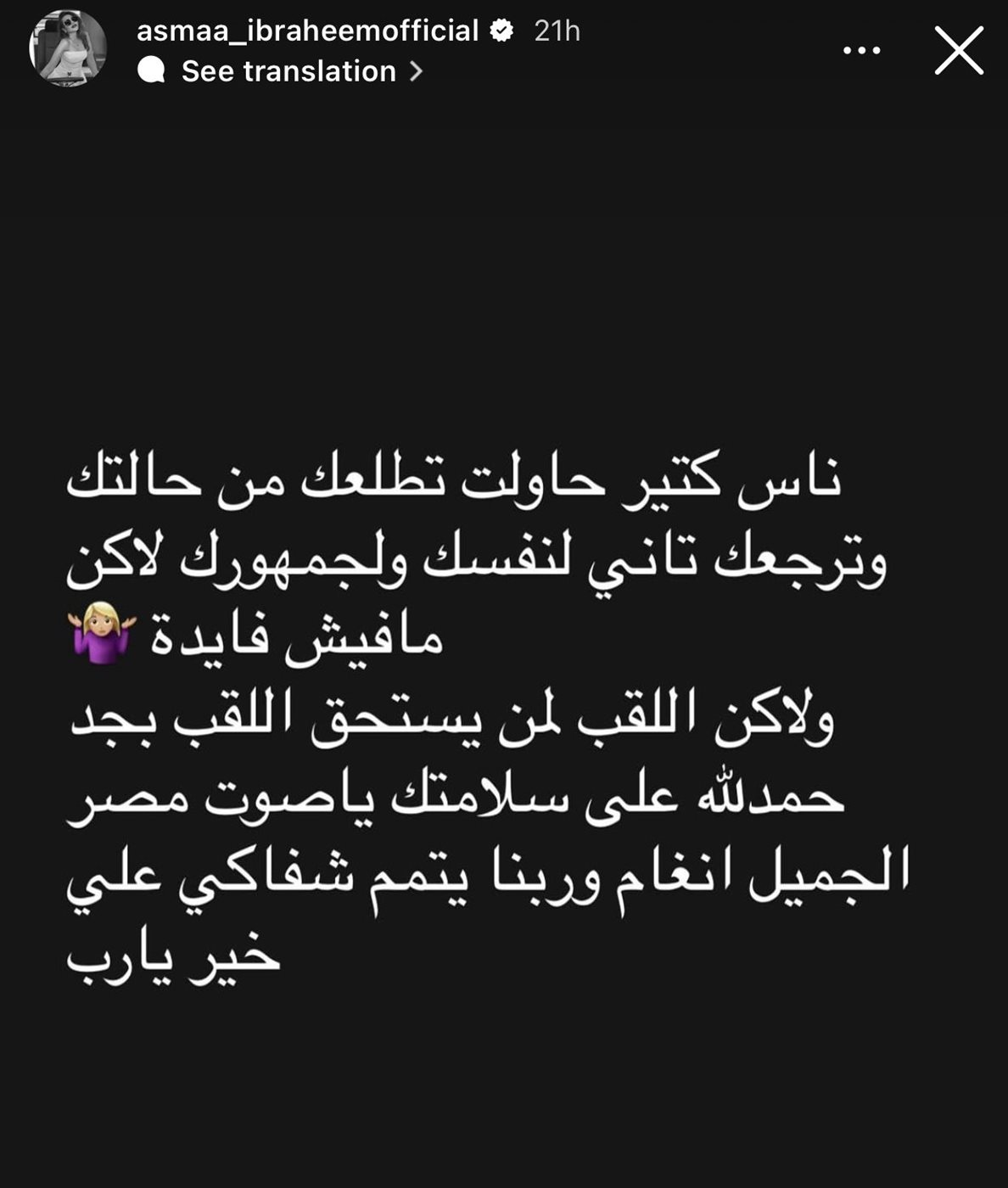 وكتبت أسما في الاستوري: "ناس كتير حاولت تطلعك من حالتك وترجعك تاني لنفسك ولجمهورك لكن مفيش فايدة.. ولكن اللقب لمن يستحق اللقب بجد حمدا لله على سلامتك يا صوت مصر الجميل أنغام وربنا يتم شفاكي على خير يا رب".