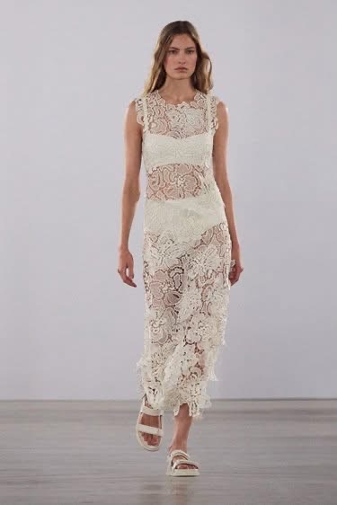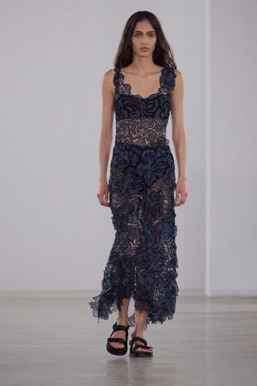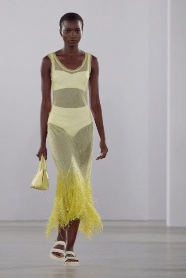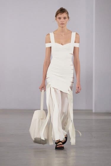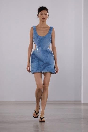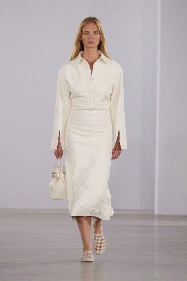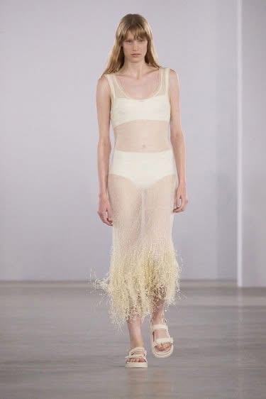 من أوّل لحظة، لفتت الأنظار الفساتين القصيرة المطرّزة بالترتر المتلألئ، والتي بدت وكأنها تلتقط أشعة الشمس لتعيد توزيعها. التصميم الأكثر خطفاً للأنفاس كان باللون الأزرق المائي، الذي استحضر صورة قشور الأسماك المتلألئة، وكأن العارضات خرجن للتو من أعماق البحر. وفي المقابل، قدّم المصمم Simkhai الفساتين الصيفية المصنوعة من دانتيل الغيبيور الرقيق، ليضيف لسمة رومانسية ناعمة وسط الطابع المرح للمجموعة. هنا تحديداً برزت جذور المصمم، إذ يعود شغفه بالدانتيل إلى إرث عائلته، حيث كان جدّه يملك مصنعاً للأقمشة المطرّزة في طهران خلال السبعينيات.