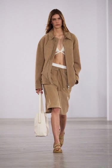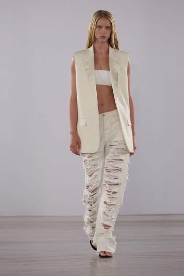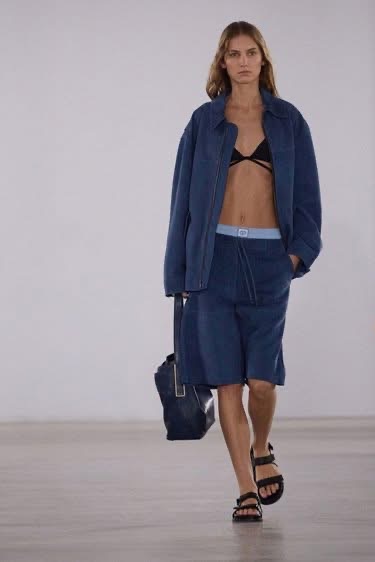 العودة إلى الماضي لم تغب عن المجموعة. شغف Simkhai بالقطع المستعملة والثريفنغ من "روز بول" انعكس بوضوح في القطع ذات الطابع الفينتاج. الجينز الممزق عند الركبتين أضفى جرأة عفوية، فيما جاءت القمصان الجلدية المتجعّدة لتكسر فكرة الكمال وتقدّم أناقة "غير مكتملة" لكنها آسرة. هذا التوازن بين القطع المصقولة وتلك العفوية جعل العرض أكثر واقعية وقرباً من أسلوب حياة المرأة المعاصرة.