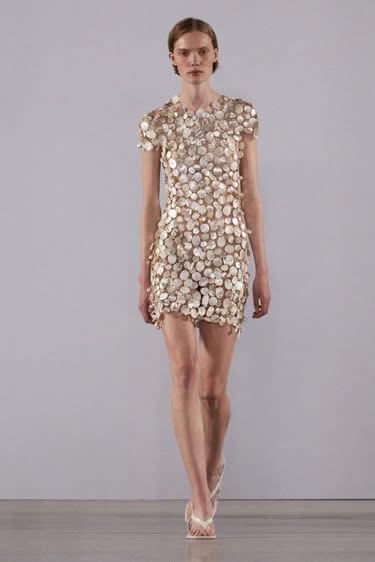 من أبرز القطع التي لفتت الأنظار هي الفساتين الشبكية المزيّنة بتمائم ذهبية على شكل أصداف، التي أوحت بشباك الصيادين العالقة على الشاطئ. أما القمصان المصنوعة من صدف أم اللؤلؤ فذكّرتنا بأجواء باكو رابان الأيقونية، مع لمسة حداثية تتماشى مع موسم الإجازات.