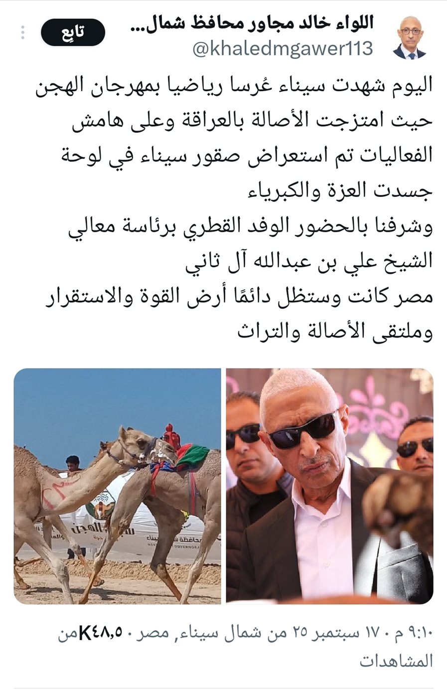وقال مجاور عبر حسابه الرسمي على منصة إكس، اليوم شهدت سيناء عُرسا رياضيا بمهرجان الهجن حيث امتزجت الأصالة بالعراقة.