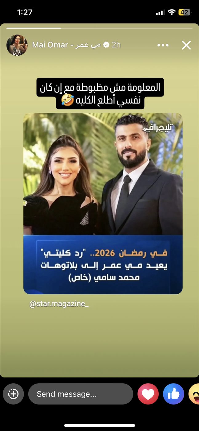 وسرعان ما تنفي مي عمر الأخبار المتداولة، حيث علقت على خبر المشاركة عبر خاصية الأستوري على حاسبها الرسمي بموقع التواصل الإجتماعي فيسبوك، وقالت: “المعلومة مش مظبوطة .. مع إن كان نفسي أطلع الكلية”.