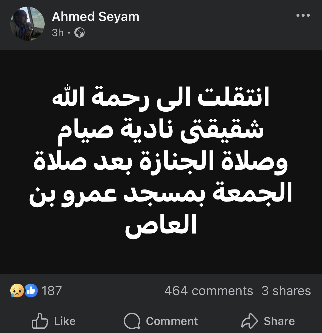 أحمد صيام يعلن وفاة شقيقته نادية صيام ويكشف عن موعد ومكان العزاء