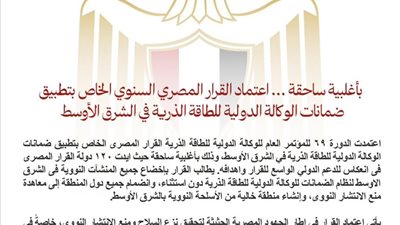 وأكد اللواء محمد عباس، أن هذا القرار يأتي تتويجًا لدبلوماسية مصرية تسعى للعمل بالتعاون مع الإرادة الإنسانية والعالمية للبحث في مسألة نزع السلاح النووي من منطقة الشرق الأوسط وجعلها خالية من هذا السلاح بما يؤكد دور مصر في صناعة استقرار وأمن وسلامة المنطقة.