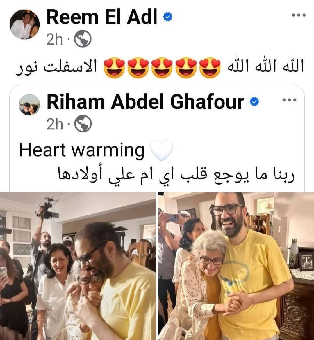 وتفاعلت الفنانة ريهام عبد الغفور مع خبر الإفراج عن علاء عبد الفتاح، ونشرت صورة له مع والدته وعلقت قائلة: ربنا ما يوجع قلب أي أم على أولادها.