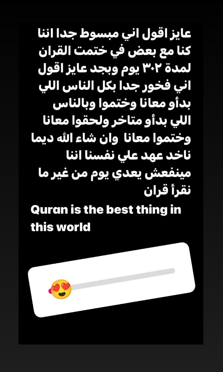 وجاء ذلك عبر بوست نشره على صفحته الرسمية بمنصة "إنستجرام" قائلًا: عايز اقول اني مبسوط جدًا اننا كنا مع بعض في ختمت القران لمدة 302 يوم وبجد عايز أقول اني فخور بكل الناس اللي بدأو معانا وختموا وبالناس اللي بدأو متأخر ولحقوا معانا وختموا معانا وان شاء الله ديما ناخد عهد على نفسنا اننا مينفعش يعدي يوم غير لمه نقرا قرأن