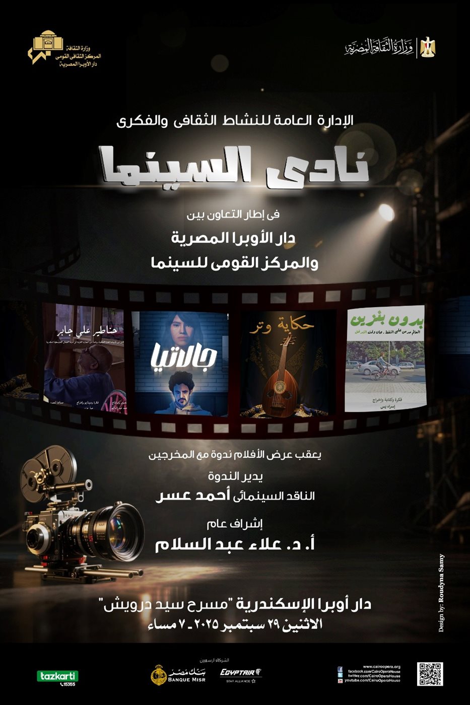 تعرض دار الأوبرا المصرية برئاسة الدكتور علاء عبد السلام فى إطار نشاطها الثقافى والفكرى تحت إشراف رشا الفقى وبالتعاون مع المركز القومى للسينما برئاسة الدكتور أحمد صالح 4 أفلام فى أمسية لنادى السينما بأوبرا الأسكندرية هى بدون بنزين، حكاية وتر، جالاتيا، حناطير على جابر ويعقبهم ندوة للمناقشة يديرها الناقد السينمائى أحمد عسر وذلك فى السابعة مساء الاثنين 29 سبتمبر على مسرح سيد درويش "أوبرا الإسكندرية" .