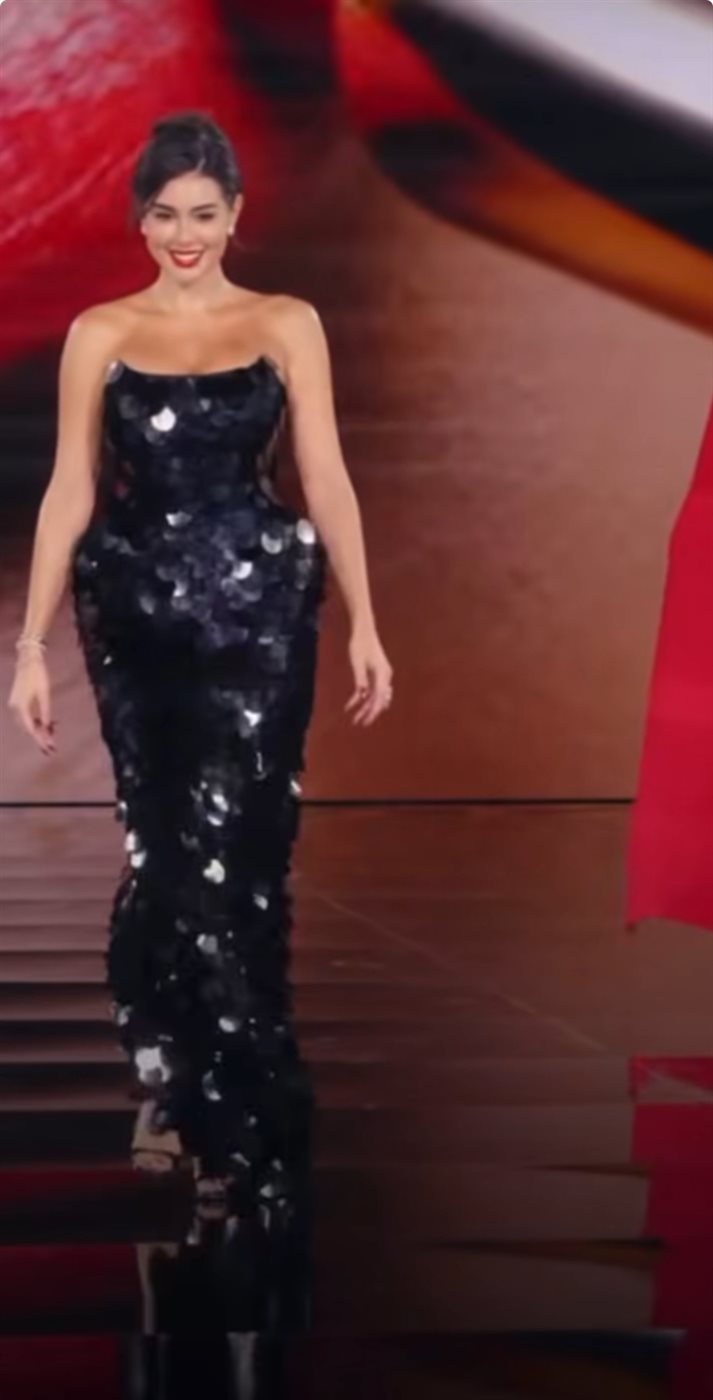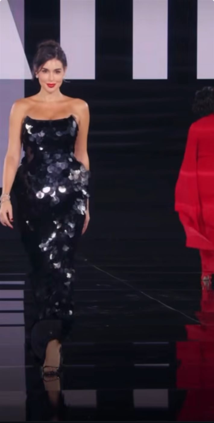 ارتدت النجمة فستان أسود اللون وطويلاً مصنوع من قشور السمك عاري الاكتاف والأكمام وذر فتحات من منطقة الظهر وفتحة من خلف الساق أبرز جمالها، كما لفتت الأنظار بمشيتها الرائعة على منصة العرض وكأنها معتادة على الظهور على الظهور على منصات العروض.