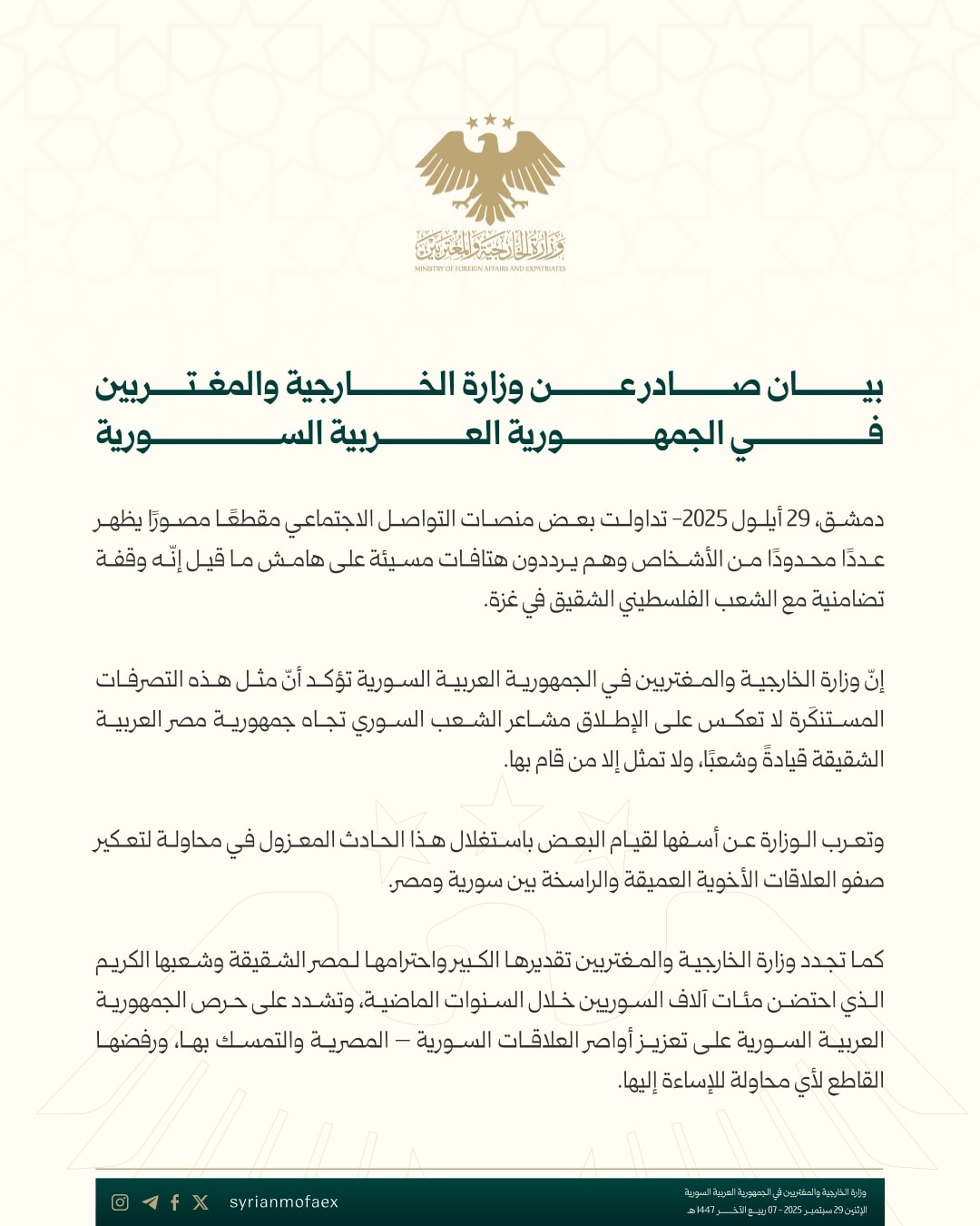 أصدرت وزارة الخارجية والمغتربين في الجمهورية العربية السورية بيانًا بشأن تداول بعض منصات التواصل الاجتماعي مقطعًا مصورًا يظهر عددًا محدودًا من الأشخاص وهم يرددون هتافات مسيئة على هامش ما قيل إنه وقفة تضامنية مع الشعب الفلسطيني الشقيق في غزة.