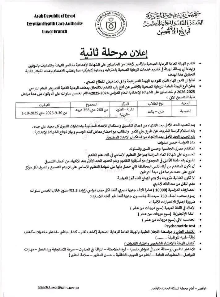 التقديم مخصص لطلاب الشهادة الإعدادية للعام الحالي من أبناء محافظة الأقصر فقط.