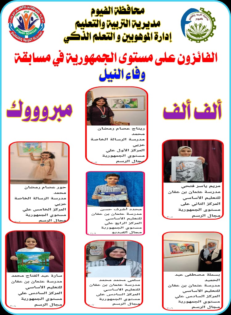 كما وجّه رسالة شكر للأستاذة رشا يوسف، وكيل المديرية ، وتوجيه التربية الفنية والشئون التنفيذية ومركز رعاية الموهوبين بالمديرية، مشيرًا إلى أن تعليم الفيوم يزخر بالطاقات الواعدة القادرة على المنافسة والتميز في مختلف المجالات.