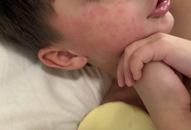 طفح جلدي: يظهر على اليدين والقدمين، وقد يمتد إلى مناطق أخرى مثل الأرداف، وتتكون من بثور.