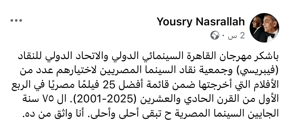 وقال يسري نصر الله: بشكر مهرجان القاهرة السينمائي الدولي والاتحاد الدولي للنقاد (فيبريسي) وجمعية نقاد السينما المصريين لاختيارهم عدد من الأفلام التي أخرجتها ضمن قائمة أفضل 25 فيلمًا مصريًا في الربع الأول من القرن الحادي والعشرين (2025-2001). ال ٧٥ سنة الجايين السينما المصرية ح تبقى أحلى وأحلى. أنا واثق من ده.