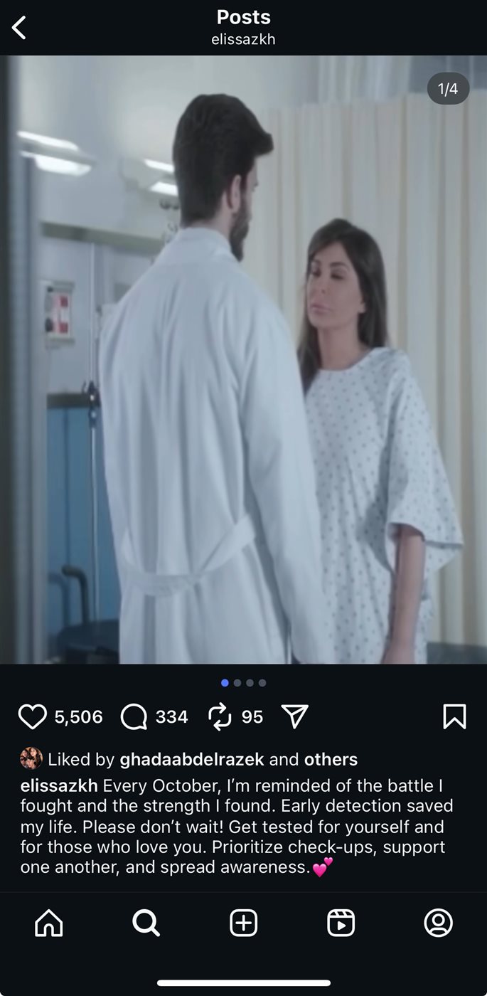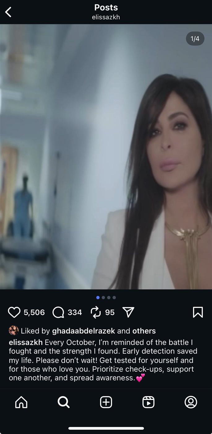 وقالت إليسا عبر حسابها الشخصي على موقع تبادل الصور والفيديوهات إنستجرام: أتذكر المعركة التي خضتها والقوة التي وجدتها في داخلي. الكشف المبكر أنقذ حياتي. من فضلك، لا تنتظر! افحص نفسك من أجل نفسك ومن أجل من يحبونك. اجعل الفحوصات أولوية، وادعم الآخرين، وانشر الوعي.