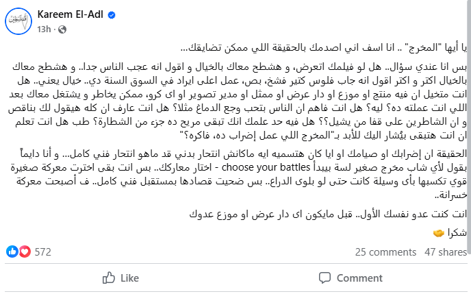 حيث قال كريم العدل في رسالته: “يا أيها المخرج .. أنا أسف أني أصدمك بالحقيقة اللي ممكن تضايقك .. بس أنا عندي سؤال.. هل لو فيلمك اتعرض .. و هشطح معاك بالخيال و اقول أنه عجب الناس جدا.. و هشطح معاك بالخيال أكتر و أكتر اقول أنه جاب فلوس كتير .. بص عمل أعلى ايراد في السوق السنة دي .. خيال يعني .. هل أنت متخيل أن فيه منتج أو موزع أو دار عرض أو ممثل أو مدير تصوير أو أى كرو .. ممكن يخاطر و يشتغل معاك بعد اللي أنت عملته ده؟ ليه؟ هل أنت فاهم أن الناس بتحب وجع الدماغ مثلا؟ هل أنت عارف أن كله هيقول لك بناقص و أن الشاطرين على قفا من يشيل؟؟ .. هل فيه حد علمك أنك تبقى مريح ده جزء من الشطارة؟ .. طب هل أنت تعلم أن أنت هتبقى بيُشار إليك للأبد بـ المخرج اللي عمل إضراب ده، فاكره؟ .. الحقيقة إن إضرابك أو صيامك أو أيًا كان هتسميه أيه ماكانش انتحار بدني قد ما هو انتحار فني كامل .. و أنا دايماً بقول لأي شاب مخرج صغير لسة بيبدأ choose your battles - اختار معاركك .. بس أنت بقى اخترت معركة صغيرة قوي تكسبها بأى وسيلة كانت حتى لو بلوى الدراع .. بس ضحيت قصادها بمستقبل فني كامل .. ف أصبحت معركة خسرانة .. أنت كنت عدو نفسك الأول .. قبل ما يكون أى دار عرض أو موزع عدوك .. شكرا”.