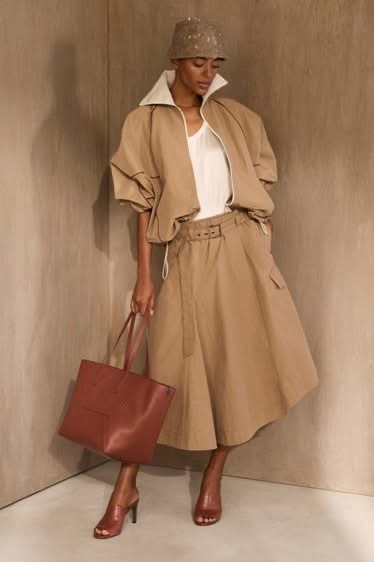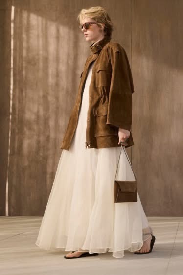 الأرض سيطرت على لوحة الألوان، حيث انعكس ذلك في درجات الرمال والطين والإكرُو الدافئة، مع أنسجة خفيفة من التويد ونقوش الشيفرون الكبيرة التي حملت توقيع الخياطة الإيطالية التقليدية، لكنها مُعادة تفسيرها بروح صيفية خفيفة.